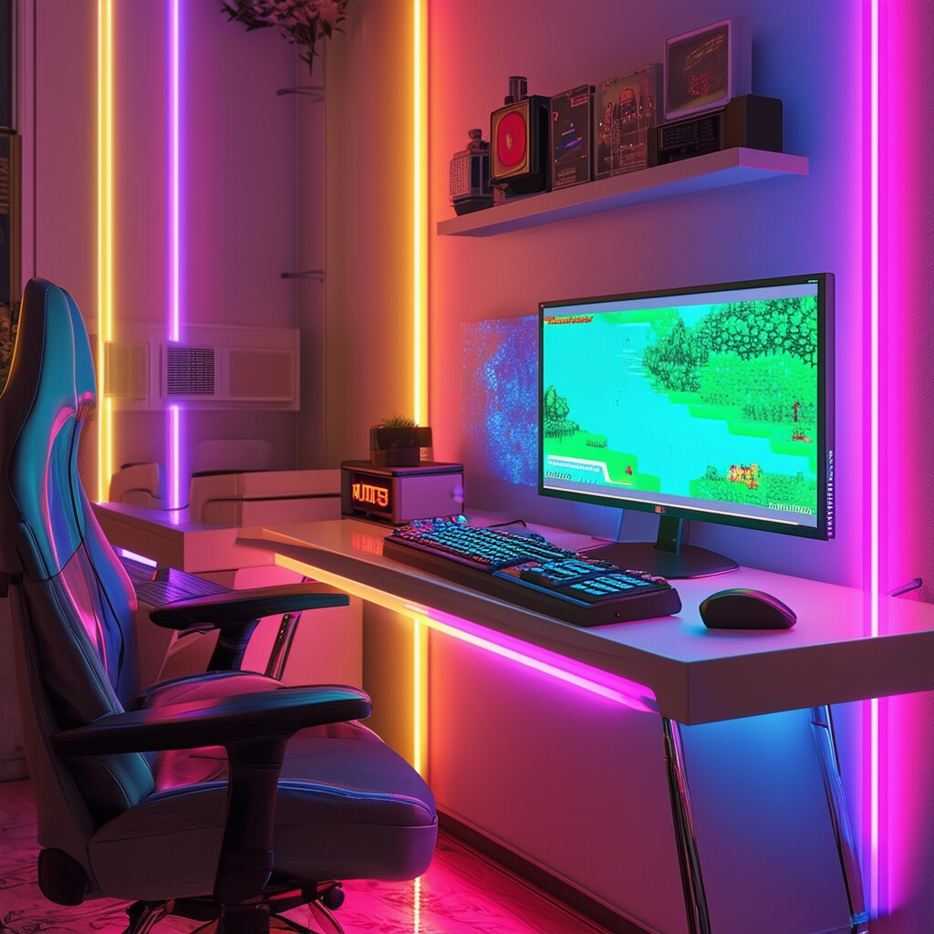 Un setup gamer bien moderno, silla gamer RGB, led en la habitación y todo