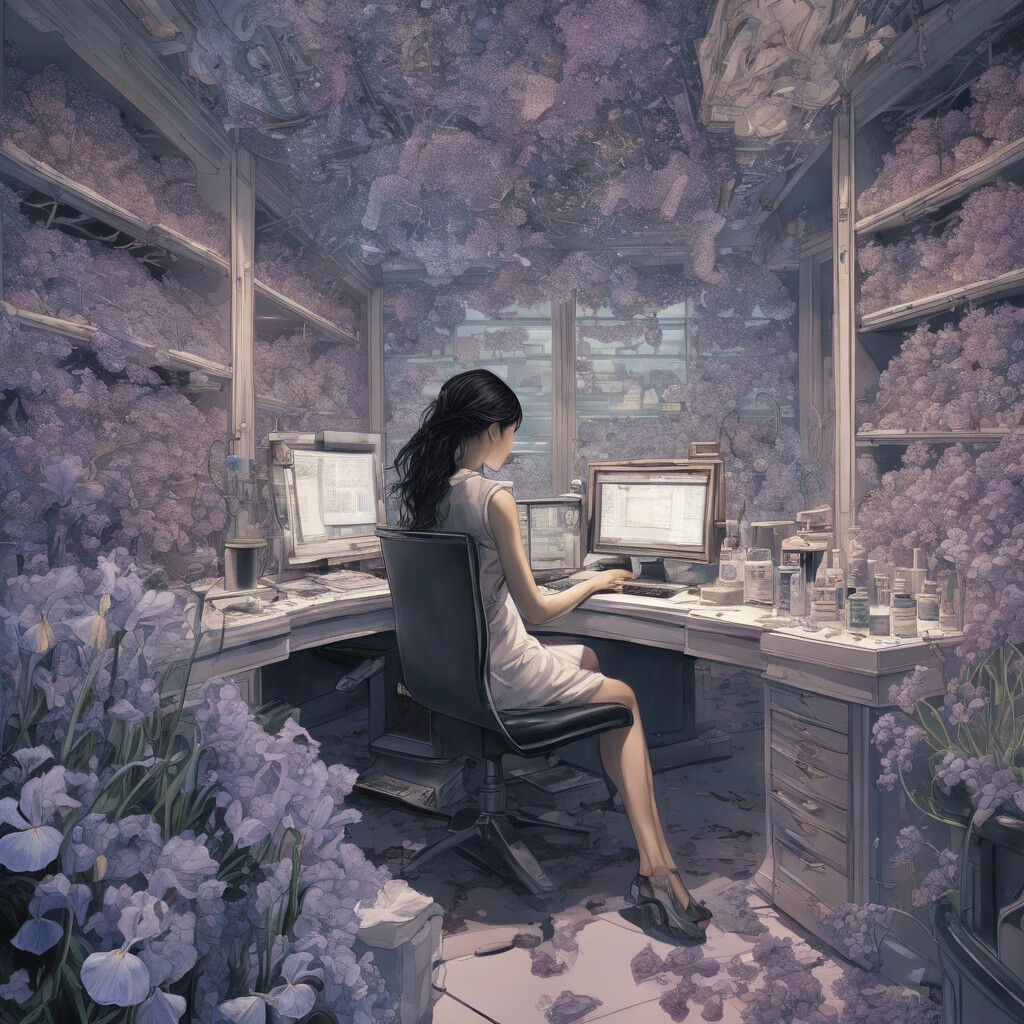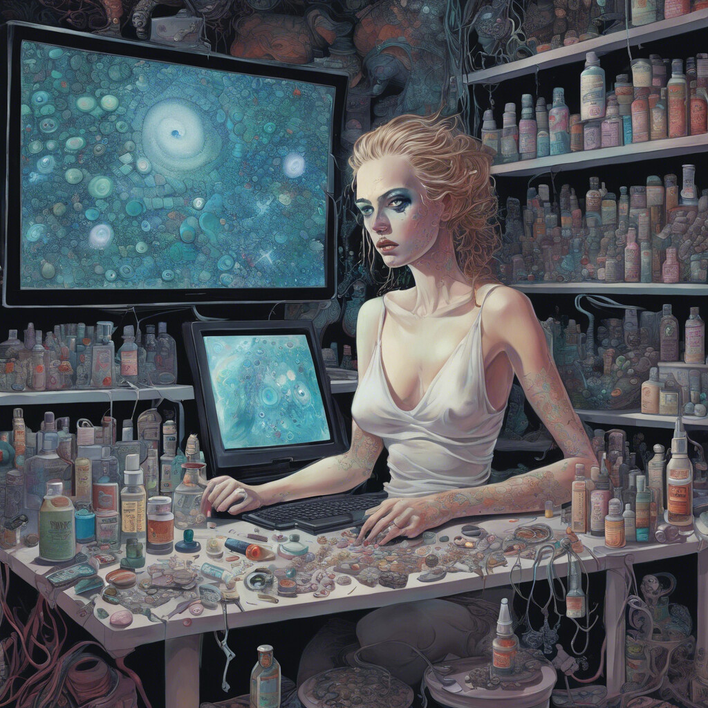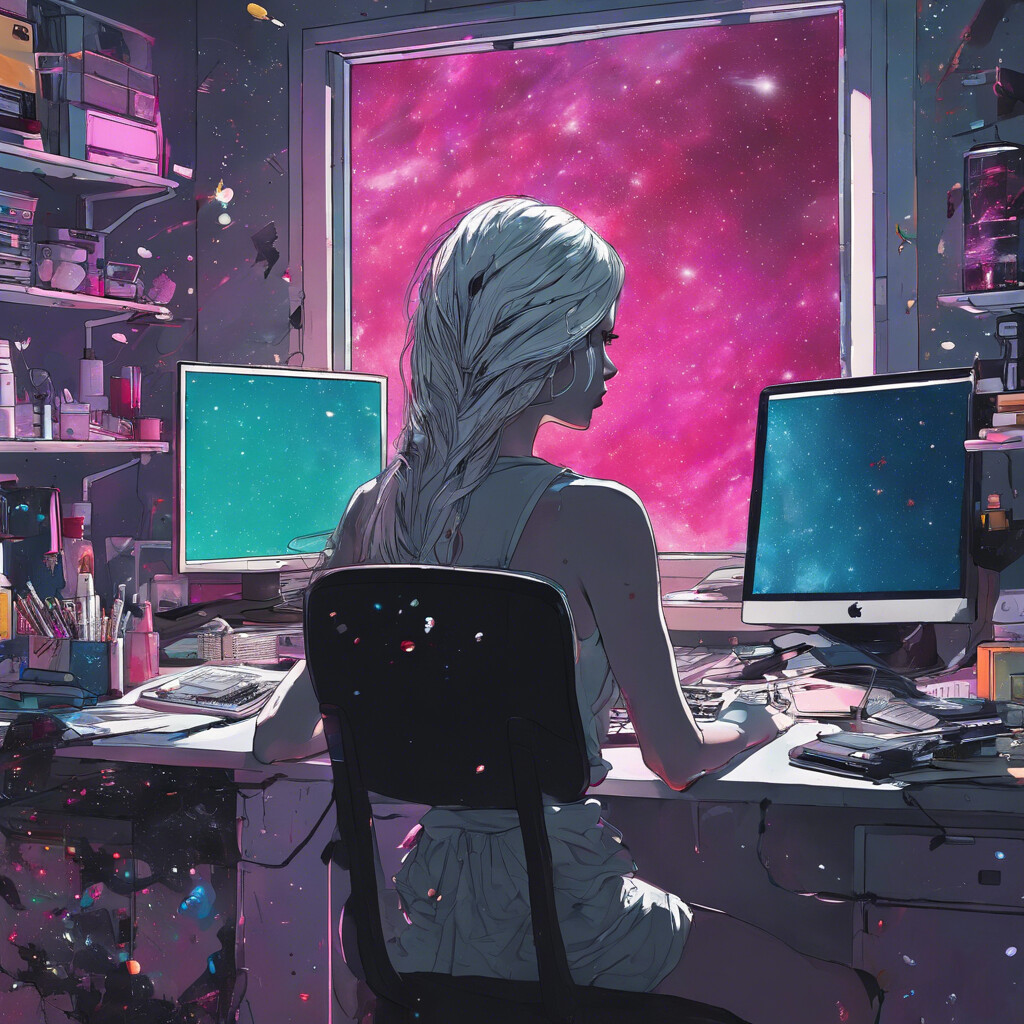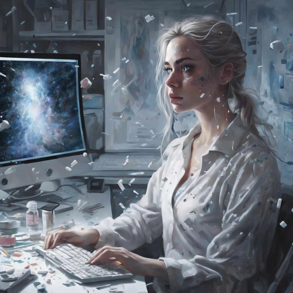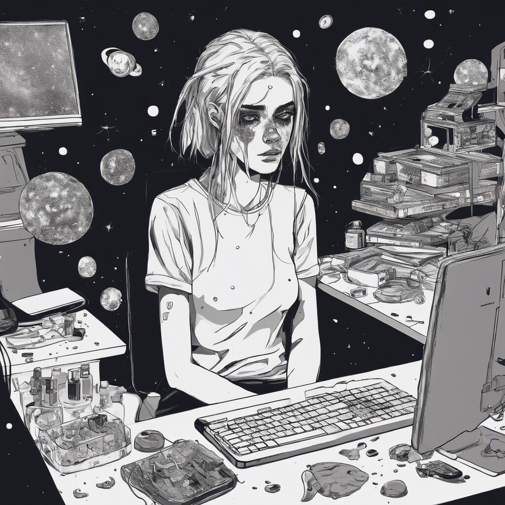 @Artista Desenha uma jovem mulher na frente do computador, com a cor dos olhos totalmente brancos e maquiagem borrada. Mostra ela com remedios espalhados perto do monitor, olhando pro nada, olhar vazios, cabelo colorido igual a galaxia. Coloque ela pensando no universo e em sua complexidade e imensidão. Deixe tudo em um ambiente bem moderno