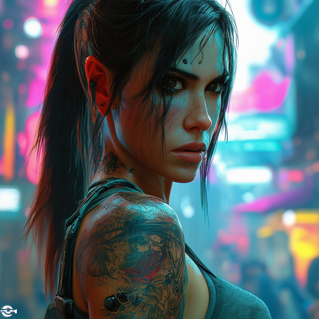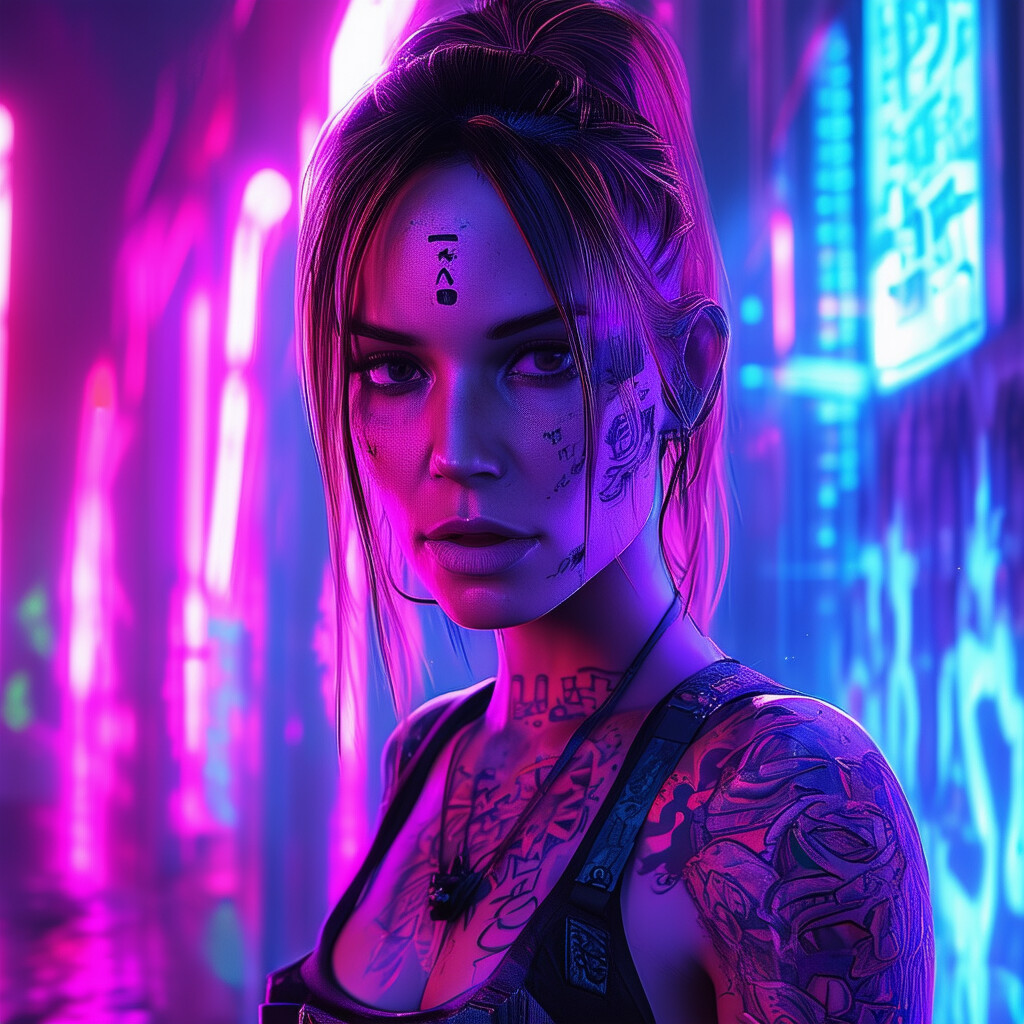 @Artista Lara Croft, de Tomb Raider, toda tatuada, en estilo cyberpunk y holográfico