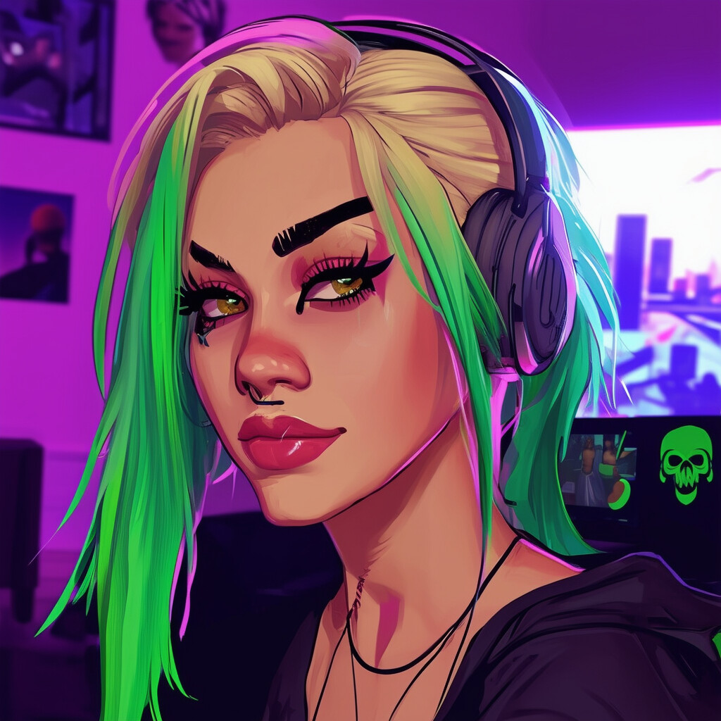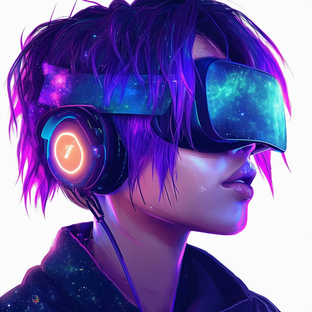 @Artista haz una gamer streamer, con el cabello color galaxia, jugando juegos de realidad virtual al estilo Second Life y FiveM. Dale una apariencia triste. Deja la imagen muy moderna.