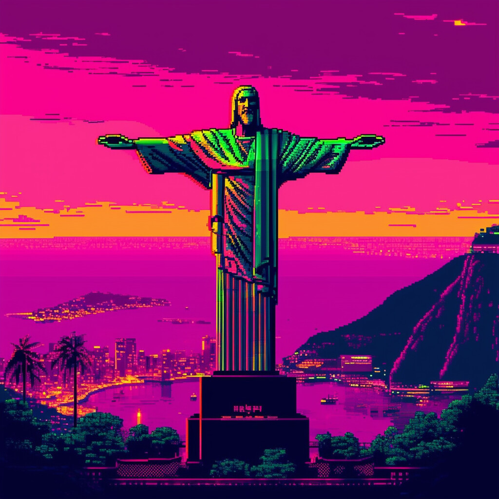 @Artista hace imágenes en estilo de 8 bits del Cristo Redentor en estilo cyberpunk