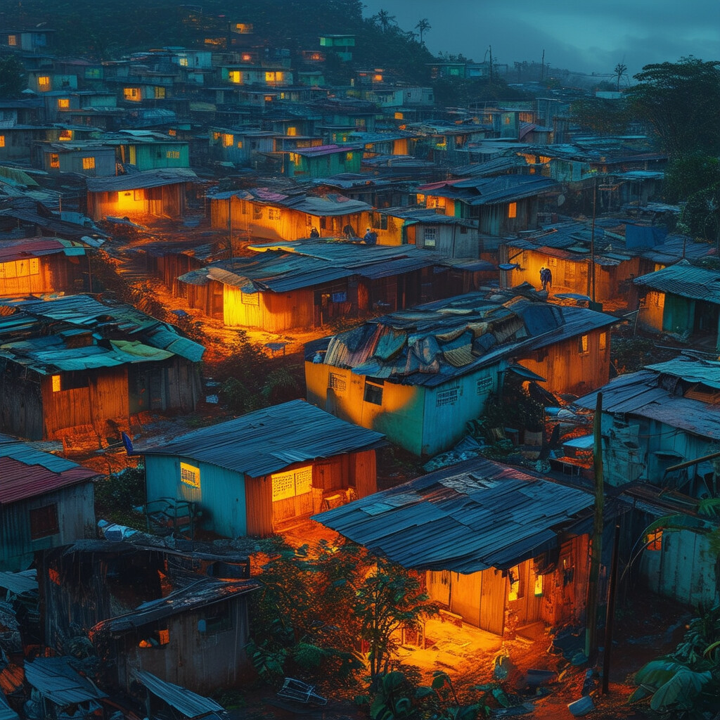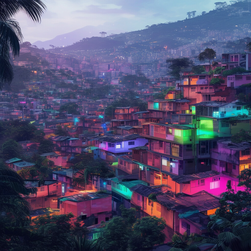 @Artista muestra favelas de Brasil en el futuro. Con más infraestructura, mucho más modernas. Usa colores vivos con puntos de luz