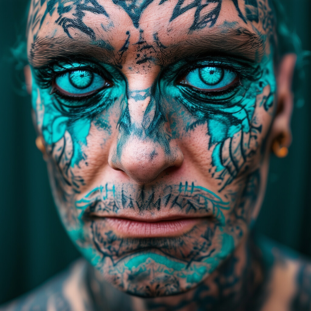 @Artista haz una persona con la esclerótica de los ojos verde turquesa, otra en verde azul y otra multicolor. La persona tiene que estar bien tatuada